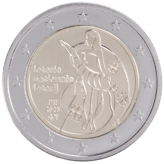 Description: The design depicts in the centre the classical allegorical representation of good fortune, the goddess Fortuna, carrying the horn of plenty. On the right and below are 4 depictions of a four-leaf clover, another universal symbol of luck. Behind the image of Fortuna, the current National Lottery logo is visible. On the left side of the coin the text “loterie nationale loterij” is displayed. On the bottom left the country code BE and the year of issue 2025 are shown. At the bottom right, the initials of designer Iris Bruijns are visible. As the Royal Dutch Mint will strike the coins, the mintmark of Utrecht, a mercury staff, is located underneath the year mark, together with the Belgian mint director mintmark, an aster flower in front of an Erlenmeyer flask. The coin’s outer ring bears the 12 stars of the European flag.