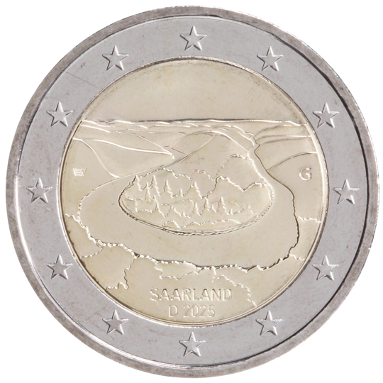 Description: The design shows the Saarschleife bend in the Saar river, reduced to the key features of the motif of the meandering river, which characterises the hilly landscape. Groups of trees depicted along the course of the river symbolise the forested landscape around the picturesque Saarschleife. The bird’s-eye perspective means that the landmark natural waterway is seen embedded in the surrounding hills, which reach off into the distance. The inscription “Saarland” is positioned low down in the foreground, in order to not disturb the landscape’s sense of calmness and light. The upper half of the coin’s inner circle also features on the left the mark of the artist, Frankfurt-based Carsten Wolff, and on the right the letter “X” as placeholder for the mint mark of the respective mint (“A”, “D”, “F”, “G” or “J”). The lower half features the inscription “SAARLAND”, Germany’s issuing country code “D” and the year of issue, “2025”. The coin’s outer ring bears the 12 stars of the European flag.