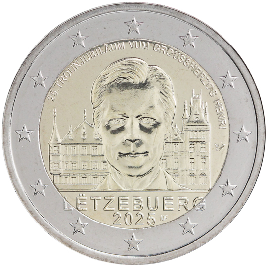 Description: The design depicts in its centre the effigy of Grand Duke Henri and in the background the grand ducal Palace. The text "25. TROUNJUBILAUM VUM GROUSSHERZOG HENRI" is depicted in semi-circular form above the effigy. The indication of the issuing country "LETZEBUERG" as well as the year of issuance “2025” appear below the effigy. The coin’s outer ring bears the 12 stars of the European flag.
