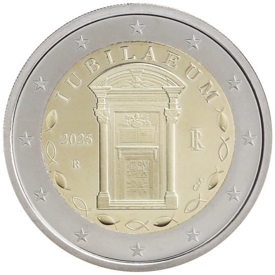 Description: The design shows, in the centre, a depiction of the Holy Door located in the Basilica of Saint Peter. At the top, in semi-circle, the inscription "IUBILAEUM", while at the bottom, always in semi-circle, closing the Latin inscription, a series of alternating empty and full fish, symbol of Christianity. On the left “2025”, year of the coin issuance and “R”, identifying the Mint of Rome; on the right “RI”, acronym of the Italian Republic and, “C.M.” author's initials (Claudia Momoni)”. The coin’s outer ring bears the 12 stars of the European flag.