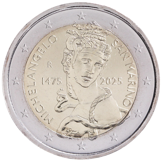 Description: The design depicts in the centre Cleopatra, detail of the drawing by Michelangelo Buonarroti, preserved at the Casa Buonarroti Foundation (Florence). At the left is the inscription “MICHELANGELO” in semi-circle, the letter R, identifying the Mint of Rome and the year “1475”, and at the right the name of issuing country “SAN MARINO” in semi-circle, the year “2025”. At the bottom are the initials of the author “SP” (Silvia Petrassi). The coin’s outer ring bears the 12 stars of the European flag.