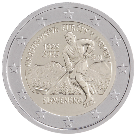 Description: The design depicts an ice hockey player in action, wearing a style of uniform typical of the period of the 1925 Ice Hockey European Championship. The player is set against a stylised panorama of the High Tatras, the Slovak mountain region where the championship took place. The inscription ‘MAJSTROVSTVÁ EURÓPY V HOKEJI’ (European championship in hockey) runs along the edge of the upper half of the coin’s inner circle. The years ‘1925’ and ‘2025’ appear in the upper left part of the design, one above the other. At the bottom is the name of the issuing country ‘SLOVENSKO’. To the right of the figure is the mint mark of Slovakia’s Kremnica Mint (Mincovňa Kremnica), the producer of the coin. Next to it are the initials ‘KL’ of the designer, Karol Ličko. The coin’s outer ring bears the 12 stars of the European flag.