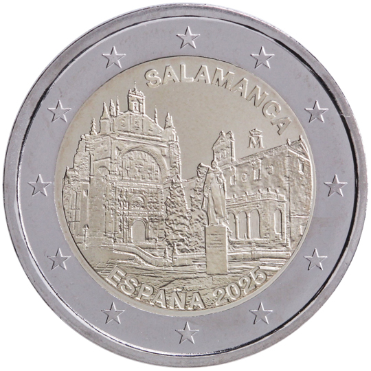 Description: The design shows a view of the "Convento de San Esteban". At the bottom, the legend ESPANA and the year of issue 2025. At the top, in capital letters, the word SALAMANCA and the mint mark "Eme Coronada". The coin’s outer ring bears the 12 stars of the European flag.