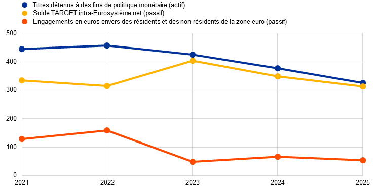 En 2025, la taille du bilan de la BCE s’est encore contractée, reculant de 37,3 milliards d’euros à 603,3 milliards d’euros, une nouvelle fois du fait des remboursements de titres détenus dans le cadre de l’APP et du PEPP. Ces remboursements se sont traduits par une diminution des titres détenus à des fins de politique monétaire, alors que leur règlement en espèces à travers les comptes TARGET a entraîné un recul correspondant des engagements intra-Eurosystème, Ce dernier n’a été que partiellement compensé par les sorties de trésorerie résultant de la baisse des dépôts placés auprès de la BCE, qui a simultanément entraîné un fléchissement des autres engagements.