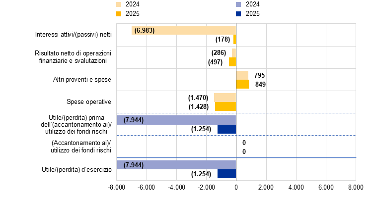La perdita della BCE per il 2025 è pari a 1.254 milioni di euro, a fronte di una perdita di 7.944 milioni nel 2024. Per decisione del Consiglio direttivo, tale perdita sarà portata a nuovo nello stato patrimoniale della BCE e coperta con gli utili degli esercizi futuri.