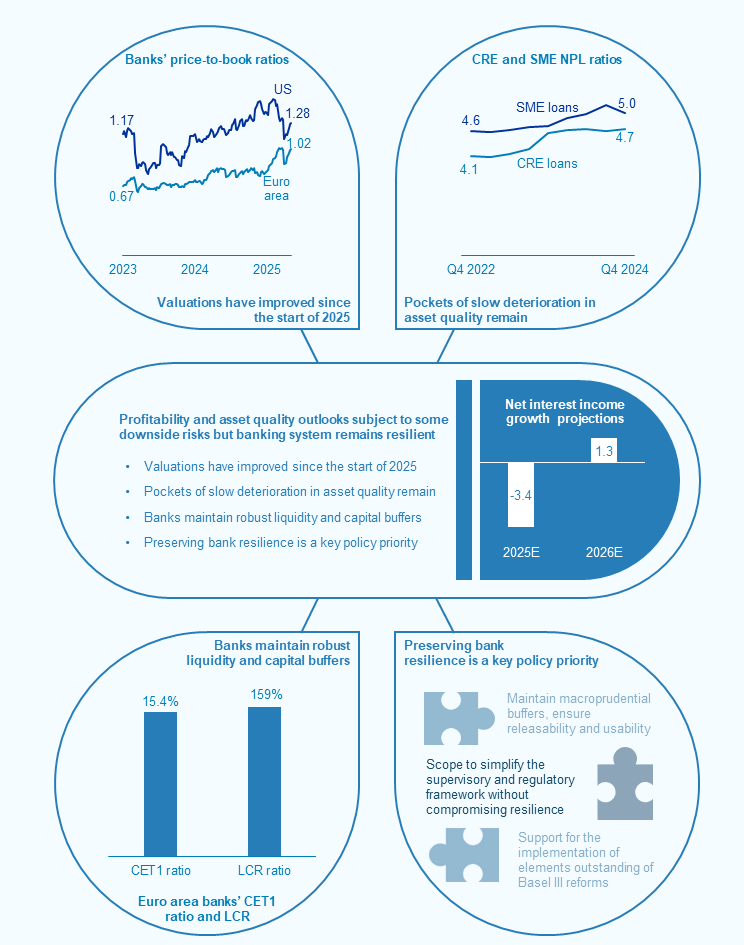 The ability of banks to absorb further asset quality deterioration is supported by the strength of profitability and ample capital and liquidity buffers. Robust net interest income and strong non-interest income growth enabled euro area banks to maintain high levels of return on equity (above 9%) in 2024. Banks’ resilience is also supported by capital and liquidity ratios that are well above regulatory requirements (Section 3.5). There are, however, persistent downside risks to bank profitability arising from lower net interest income, especially for banks with a higher share of floating-rate loans, and a higher cost of risk. A highly uncertain external environment reinforces the need for macroprudential capital buffer requirements to be kept at levels that preserve banking sector resilience. Existing borrower-based measures should be maintained to ensure sound lending standards in all phases of the financial cycle. The prevailing regulatory and supervisory framework, including in the macroprudential remit, has been effective in maintaining financial stability while also supporting economic growth. Nevertheless, there is scope for making the framework more efficient and effective by reducing unwarranted complexities without compromising bank resilience or undermining compliance with the Basel framework, and by completing the banking union.