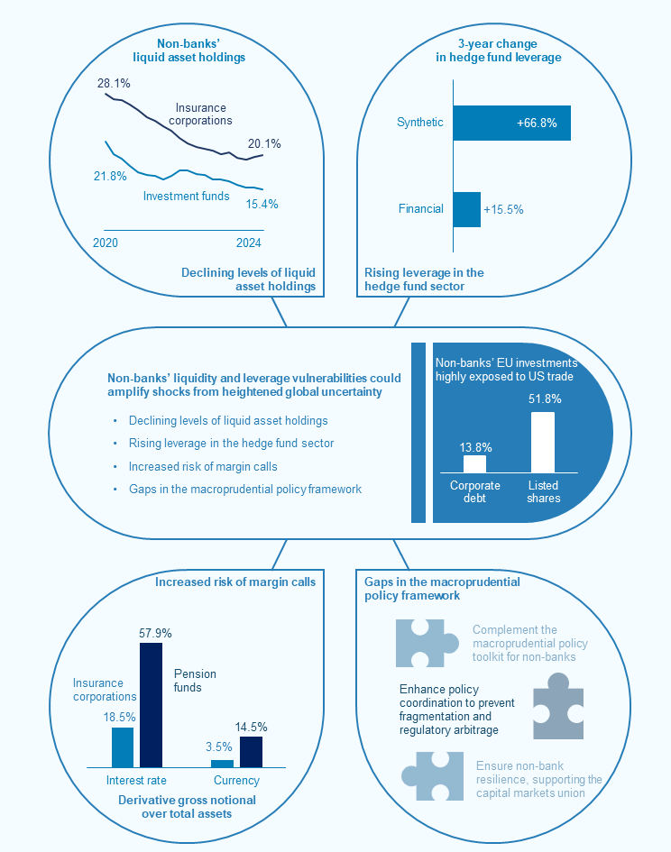 Persistent liquidity and leverage vulnerabilities in the NBFI sector require a comprehensive policy response. A bigger market footprint and the increased interconnectedness of non-banks raises the risk of NBFI vulnerabilities amplifying adverse market developments across the financial system. This calls for a comprehensive set of policy measures aimed at increasing the sector’s resilience to market-wide shocks. An adequate policy response should focus on addressing key structural vulnerabilities in the NBFI sector, including monitoring and tackling risks arising from non-bank leverage, enhancing the liquidity preparedness of non-bank market participants to meet margin and collateral calls, and mitigating liquidity mismatch in the investment fund sector. The further deepening and integration of capital markets forms part of a renewed strategy aimed at supporting Europe’s productivity and economic growth in a competitive global environment. Strengthening NBFI policies from a macroprudential perspective would help ensure that non-banks remain resilient under stress, underpinning the long-term success of the capital markets union agenda. Enhanced EU-wide supervisory coordination will be needed to foster a level playing field and reduce the potential for regulatory arbitrage.