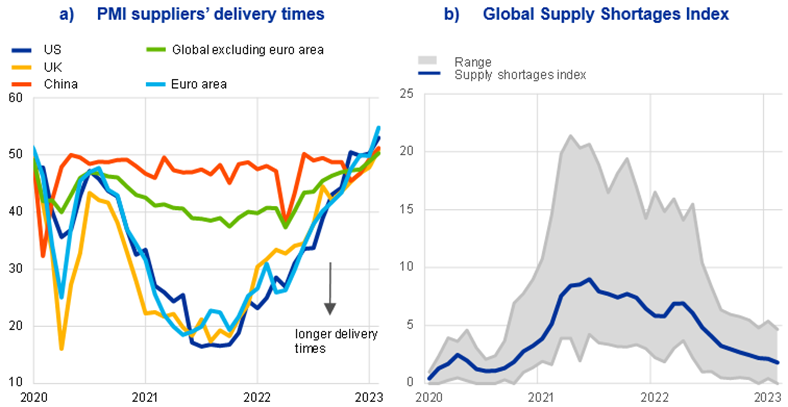 The Global Supply Chain Pressure Index, developed by the Federal Reserve Bank of New York, decreased considerably in February 2023 and is now below its historical average. This decrease was broad-based across factors but driven mainly by a decline in European and Asian delivery times. This latest estimate suggests that global supply chain conditions have largely normalised.