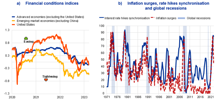 Notes: Panel a): Country-level indices are aggregated as a weighted average using GDP purchasing power parity percentage shares. An increase reflects loosening financial conditions. A decrease reflects tightening financial conditions. The latest observations are for 17 March 2023.