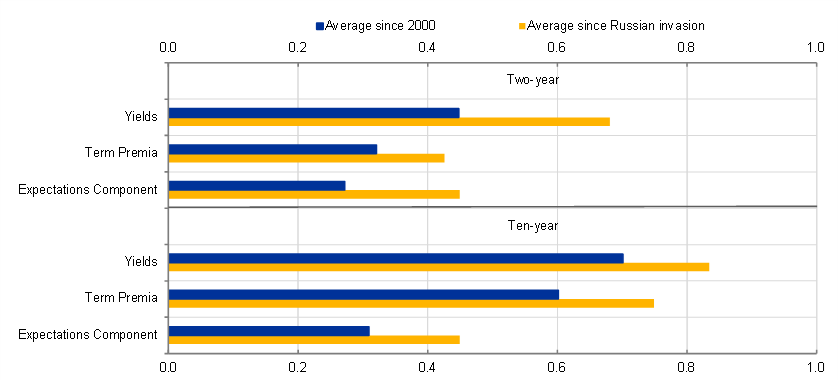 Notes: The sample consists of ten advanced economies (Australia, Canada, Denmark, euro area, Japan, New Zealand, Sweden, Switzerland, United Kingdom and United States). The bilateral correlation coefficients are averaged across these countries and time periods. The term premia and expectations components are the average of estimates from three models (dynamic Nelson-Siegel, rotated dynamic Nelson-Siegel and dynamic Svensson-Soderlind). The latest observations are for 9 March 2023.