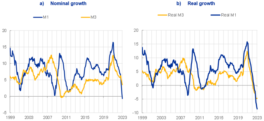 The decline in M1 largely reflects shifts away from the unusually large stock of overnight deposits towards other less-liquid but better-remunerated instruments. The sharp deceleration in M3 is driven by the run-off of the Eurosystem balance sheet and the sharp slowdown in credit.