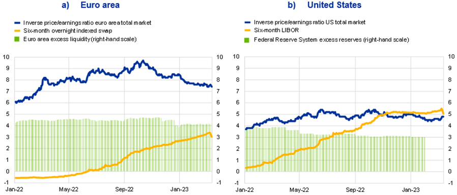 Notes: The inverse price/earnings ratio is a gauge of the earnings yield of holding stocks, shown here in comparison to risk-free rates. In panel a), excess liquidity is calculated as banks’ current account and deposit facility holdings minus their minimum reserve requirements. In panel b), excess reserves are calculated as reserves of depository institutions minus required reserves (the latter are set to zero in 2020). The latest observations in panel a) are 13 March 2023 for financial market data and 8 March 2023 for excess liquidity. The latest observations in panel b) are 13 March 2023 for financial market data and January 2023 (monthly data) for excess reserves.