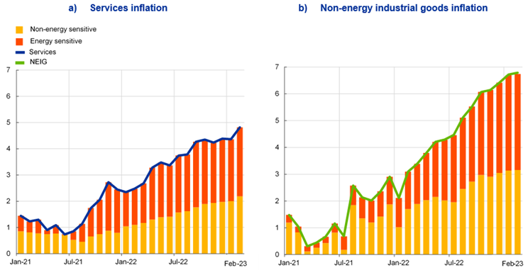 Notes: The term “energy-sensitive component” reflects items with a share of energy in direct costs above the average share of energy across services items (panel a) and non-energy industrial goods (NEIG) items (panel b). The latest observations are for February 2023.