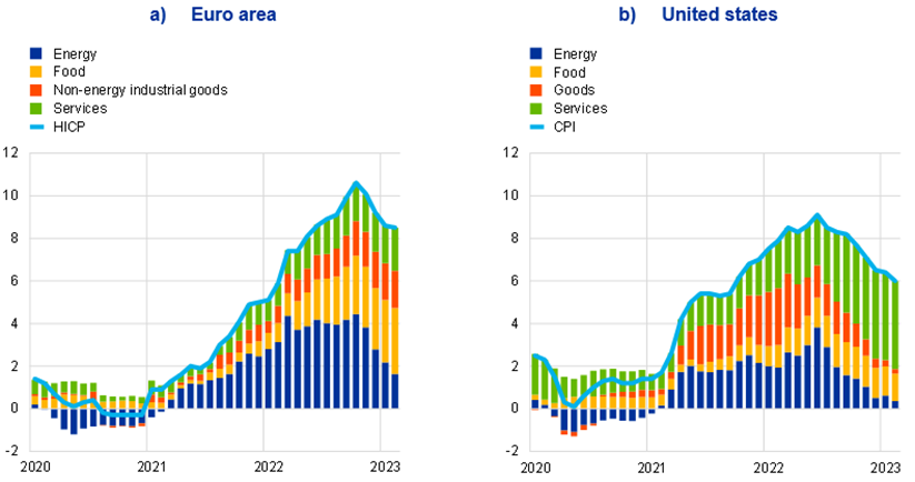 Headline inflation and components in the euro area and the United States