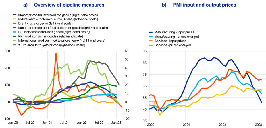 Notes: Panel a): For Brent crude oil in euro, the monthly value represents the average of the data available (working days up to the day of the update). The latest observations are for 15 March 2023 for Brent crude oil in euro, February 2023 for euro area farm gate prices and international food commodity prices and January 2023 for the other items. Panel b): The latest observations are for February 2023.