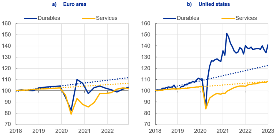 Notes: Dotted lines denote the linear trend (from the first quarter of 2018 to the fourth quarter of 2019). Durables and services for the euro area are approximated using a bottom-up aggregation of available country-level data.