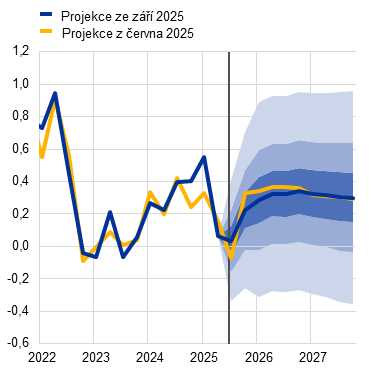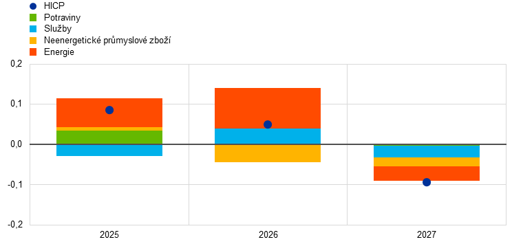 Výhled inflace odpovídá tomu, že se inflace stabilizuje poblíž 2% střednědobého cíle. Celková inflace, měřená harmonizovaným indexem spotřebitelských cen (HICP), by měla po zbytek roku 2025 kolísat poblíž 2 %, v roce 2026 klesnout na 1,7 % a následně se v roce 2027 zotavit na úroveň 1,9 %. Pokles v roce 2026 odráží další postupné snižování cen neenergetických složek, zatímco růst cen energií by měl zůstat volatilní, ale v horizontu projekcí by měl zesílit, částečně v důsledku spuštění systému EU pro obchodování s emisemi ETS2 v roce 2027. Očekává se, že ceny potravin zpočátku i nadále porostou rychleji, neboť se projeví zpožděné dopady dřívějšího růstu cen mezinárodních potravinářských komodit. V letech 2026 a 2027 by však růst měl zmírnit na úroveň mírně nad 2 %. Inflace měřená HICP bez započtení energií a potravin (HICPX) by měla klesat s tím, jak poleví mzdové tlaky a zmírní se růst cen služeb a jak se posilování eura projeví v cenovém řetězci a omezí růst cen zboží. Očekává se, že nižší růst mezd vyplývající z již realizované kompenzace ztrát reálných mezd v minulosti a oživení růstu produktivity povedou k výrazně pomalejšímu růstu jednotkových mzdových nákladů. V porovnání s projekcemi z června 2025 byl výhled celkové inflace měřené HICP revidován pro rok 2025 i 2026 o 0,1 procentního bodu směrem nahoru. Důvodem jsou vyšší aktuální údaje o cenách energetických komodit i předpoklady o jejich budoucím vývoji a také zpožděné účinky vyšších mezinárodních cen potravinářských komodit, které převažují nad posílením eura. Očekává se, že v roce 2027 budou převládat zpožděné účinky posilování eura, což povede k revizi o 0,1 procentního bodu směrem dolů.