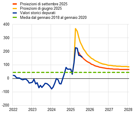 Le ipotesi tecniche sono aggiornate al 15 agosto 2025. Le proiezioni macroeconomiche per il contesto internazionale e l’area dell’euro sono state ultimate il 28 agosto 2025.