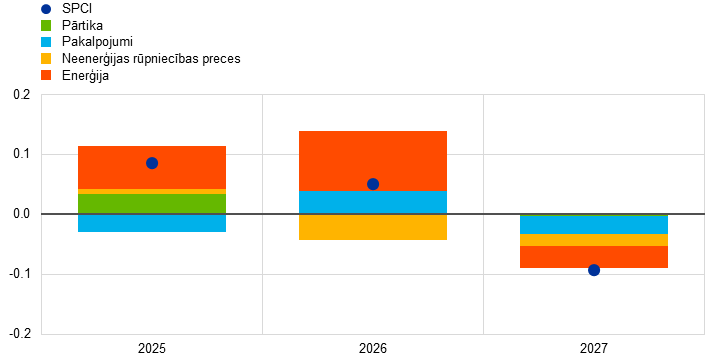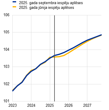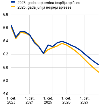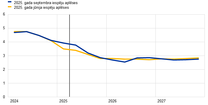 Inflācijas perspektīva ir saskaņā ar inflācijas stabilizēšanos aptuveni 2 % vidējā termiņa mērķa līmenī. Paredzams, ka kopējā inflācija, ko mēra ar saskaņoto patēriņa cenu indeksu (SPCI), atlikušajos 2025. gada mēnešos virzīsies horizontāli aptuveni 2 % līmenī un pēc tam 2026. gadā saruks līdz 1.7 %, bet pēc tam 2027. gadā atkal pieaugs līdz 1.9 %. Kritums 2026. gadā atspoguļo turpmāku pakāpenisku neenerģijas komponentu sarukumu, savukārt enerģijas cenu inflācija arī turpmāk būs svārstīga, bet iespēju aplēšu periodā pieaugs, daļēji tāpēc, ka 2027. gadā sāks darboties otrā ES emisijas kvotu tirdzniecības sistēma (ETS2). Gaidāms, ka pārtikas cenu inflācija sākotnēji saglabāsies paaugstināta sakarā ar starptautisko pārtikas izejvielu cenu agrākā kāpuma novēloto ietekmi, bet 2026. un 2027. gadā kāpuma temps kļūs lēnāks (nedaudz virs 2 %). Gaidāms, ka SPCI inflācija (neietverot enerģijas un pārtikas cenas; SPCIX) pazemināsies, mazinoties darba samaksas spiedienam un pakalpojumu cenu inflācijai kļūstot mērenākai un euro kursa kāpumam atspoguļojoties dažādos cenu noteikšanas posmos un ierobežojot preču cenu inflāciju. Gaidāms, ka darba samaksas pieauguma kritums pēc tam, kad būs atgūti agrākie reālās darba samaksas zaudējumi, kopā ar darba ražīguma pieauguma atjaunošanos noteiks būtiski lēnāku vienības darbaspēka izmaksu pieaugumu. Salīdzinājumā ar 2025. gada jūnija iespēju aplēsēm kopējās SPCI inflācijas perspektīva gan 2025., gan 2026. gadam koriģēta un paaugstināta par 0.1 procentu punktu sakarā ar augstākiem enerģijas izejvielu cenu rezultātiem un pieņēmumiem, kā arī augstāku starptautisko pārtikas izejvielu cenu novēloto ietekmi, kas ar uzviju kompensē euro kursa kāpumu. Tiek uzskatīts, ka 2027. gadā euro kursa kāpuma novēlotā ietekme dominēs, tāpēc attiecīgi veikta lejupvērsta korekcija par 0.1 procentu punktu.