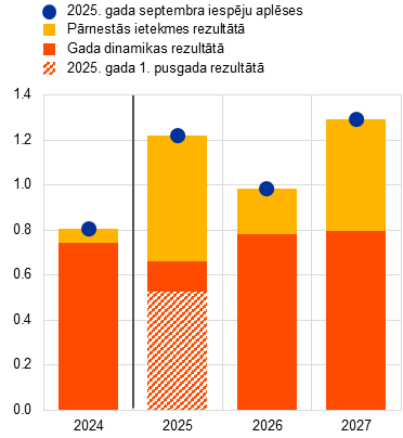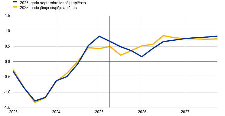 Tirdzniecības tarifi un ar tiem saistītā nenoteiktība 2025. gada 1. pusgadā veicināja spēcīgas ekonomiskās aktivitātes svārstības, kas skaidrojamas ar darījumu priekšpiegādi, īpaši Īrijā. Gaidāms, ka, šiem faktoriem izzūdot, 2. pusgadā būs vērojamas turpmākas svārstības, tāpēc signāli par eurozonas tautsaimniecības izaugsmes pamattempu būs neskaidri. Neņemot vērā Īrijas datu svārstību radīto svārstīgumu, tautsaimniecības izaugsme pārējā eurozonā faktiski bijusi stabilāka, un līdzīga aina gaidāma arī 2. pusgadā. Lai gan jaunā ASV un ES tirdzniecības vienošanās paredz augstākus tarifus eurozonas eksportam uz ASV, tā palīdzējusi mazināt ar tirdzniecības politiku saistīto nenoteiktību. Paredzams, ka vēlāk iespēju aplēšu periodā eurozonas tautsaimniecības izaugsme kļūs spēcīgāka, un to veicinās vairāki faktori. Reālās darba samaksas un nodarbinātības kāpumam, kā arī jaunajiem valdības izdevumiem infrastruktūrai un aizsardzībai (galvenokārt Vācijā) vajadzētu veicināt eurozonas iekšzemes pieprasījumu. Turklāt tiek uzskatīts, ka izaugsmes perspektīvu veicinās arī mazāk ierobežojoši finansēšanas nosacījumi, galvenokārt atspoguļojot nesenos monetārās politikas lēmumus, un ārējā pieprasījuma atjaunošanās 2027. gadā. Paredzams, ka gada vidējais reālā IKP pieauguma temps 2025. gadā būs 1.2 %, 2026. gadā – 1.0 % un 2027. gadā – 1.3 %. Salīdzinājumā ar Eurosistēmas speciālistu 2025. gada jūnija makroekonomiskajām iespēju aplēsēm IKP pieauguma perspektīva 2025. gadam koriģēta un paaugstināta par 0.3 procentu punktiem, atspoguļojot labākus, nekā gaidīts, saņemtos datus un vēsturisko datu korekciju pārnesto ietekmi. Tā kā ne visi ar datiem saistītie pārsteigumi attiecas uz spēcīgāku, nekā iepriekš tika pieņemts, darījumu priekšpiegādi, tiek uzskatīts, ka 2. pusgadā tie tiks tikai daļēji kompensēti. Sakarā ar euro kursa kāpumu un vājāku ārējo pieprasījumu (kas daļēji saistīts ar nedaudz augstākiem tarifiem, nekā tika pieņemts jūnija iespēju aplēsēs) 2026. gadā veikta lejupvērsta korekcija par 0.1 procentu punktu. Iespēju aplēse 2027. gadam nav mainījusies.[1]