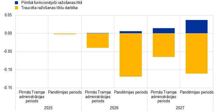 Pirmās alternatīvās tendences gadījumā makroekonomiskā ietekme uz eurozonu ir minimāla, bet otrās alternatīvās tendences gadījumā tā ir būtiska un tāpat kā pandēmijas laikā ietver nopietnākus piegādes ķēžu pārrāvumus. Vispirms pievēršoties rezultātiem apstākļos, kad ražošanas tīkli tautsaimniecībā ir pilnībā funkcionējoši, un izmantojot ECB-BASE modeli, scenārijā, kurā vērojamas tādas pašas piegādes problēmas kā pirmās Trampa administrācijas laikā, rastos tikai minimāls inflācijas spiediens un SPCI inflācija 2027. gadā būtu mazāk par 0.1 procentu punktu augstāka (20. attēls, b) panelis, zilie stabiņi). Scenārijā, kurā šoki ir līdzīgi pandēmijas periodā piedzīvotajiem šokiem, ietekme uz inflāciju būtu būtiski spēcīgāka un SPCI inflācija 2027. gadā būtu par 0.15 procentu punktiem augstāka (20. attēls, b) panelis, zilie stabiņi). Abās jutīguma analīzēs ietekme uz reālo IKP ir nenozīmīga vai nedaudz pozitīva, atspoguļojot pieņēmumu par nemainīgām procentu likmēm, kas, ņemot vērā augstāku inflāciju, ietver reālo procentu likmju kritumu, kas stimulētu aktivitāti (20. attēls, a) panelis, zilie stabiņi). Lai analīze būtu plašāka, izmantots daudzvalstu un daudznozaru modelis, kurā ņemtas vērā saiknes starp ielaidi un izlaidi, kas nosaka, ka citos reģionos papildus piegādes ķēžu traucējumiem cieš arī ražošanas tīkli. Šāds pieņēmums samazina ražošanas ķēžu aizstājamību, izraisot izteiktāku ietekmi (20. attēls, dzeltenie stabiņi). Šajā gadījumā salīdzinājumā ar pamatscenāriju scenārijā, kas līdzinās pirmās Trampa administrācijas laikam, inflācija 2027. gadā varētu būt par 0.1 procentu punktu augstāka, savukārt smagākajā scenārijā, kas līdzinās pandēmijas laikam, – gandrīz par 0.25 procentu punktiem augstāka, un IKP pieaugums būtu nedaudz ierobežots.[19]