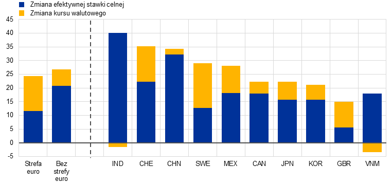 W porównaniu z projekcjami z czerwca 2025 efektywne stawki celne w Stanach Zjednoczonych na import ze strefy euro i od wszystkich partnerów handlowych są wyższe w następstwie umowy handlowej między USA a UE i innych komunikatów. W projekcjach ekspertów uwzględniono stawki celne, odroczenia i zwolnienia obowiązujące na dzień będący datą graniczną projekcji (28 sierpnia) i założono, że pozostaną one na takim samym poziomie przez cały horyzont projekcji.