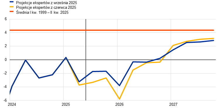 Aktywność gospodarcza w pierwszej połowie 2025 mocno się wahała z powodu ceł handlowych i związanej z nimi niepewności, przy czym początkowo przyspieszyła, zwłaszcza w Irlandii. Ustępowanie tych czynników w drugim półroczu według oczekiwań będzie powodować dalszą zmienność, przez co sygnały dotyczące dynamiki wzrostu gospodarczego w strefie euro staną się mniej jasne. Gdy pominie się zmienność spowodowaną wahaniami danych dla Irlandii, w rzeczywistości wzrost gospodarczy w pozostałej części strefy euro był stabilniejszy i według oczekiwań tak pozostanie w drugiej połowie roku. Nowa umowa handlowa między USA a UE oznacza wprawdzie wyższe cła na eksport ze strefy euro do Stanów Zjednoczonych, ale pomogła zmniejszyć niepewność co do polityki handlowej. W dalszej części horyzontu projekcji wzrost gospodarczy w strefie euro ma się zwiększyć, pod wpływem kilku czynników. Popyt wewnętrzny w strefie euro powinny wzmacniać rosnące płace realne i zatrudnienie oraz nowe wydatki publiczne na infrastrukturę i obronność, głównie w Niemczech. Ponadto na perspektywy wzrostu gospodarczego korzystnie wpływają mniej restrykcyjne warunki finansowania, wynikające głównie z ostatnich decyzji w sprawie polityki pieniężnej, oraz odbicie popytu zewnętrznego w 2027. Przewiduje się, że średnioroczna dynamika realnego PKB wyniesie 1,2% w 2025, 1,0% w 2026 i 1,3% w 2027. W porównaniu z projekcjami makroekonomicznymi ekspertów Eurosystemu z czerwca 2025 perspektywy wzrostu PKB na 2025 zrewidowano w górę o 0,3 pkt proc. Odzwierciedla to lepsze, niż oczekiwano, napływające dane i efekt przeniesienia wynikający z rewizji wcześniejszych danych. Ponieważ nie wszystkie zaskakujące dane są związane z silniejszym, niż wcześniej zakładano, początkowym przyspieszeniem aktywności, są one jedynie częściowo kompensowane w drugim półroczu. Aprecjacja euro i słabszy popyt zewnętrzny (wynikający po części z nieco wyższych, niż zakładano w projekcjach czerwcowych, stawek celnych) doprowadziły do rewizji w dół o 0,1 pkt proc. projekcji realnego PKB na 2026. Projekcja na 2027 pozostaje bez zmian[1].