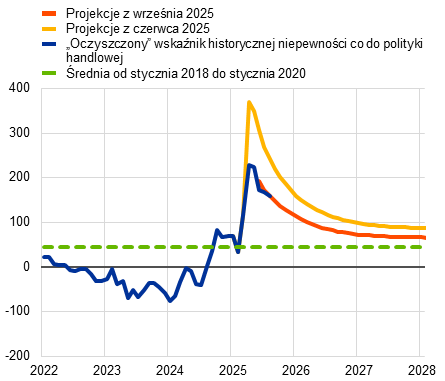 Na podstawie „nieskorygowanego” wskaźnika niepewności dotyczącej polityki handlowej, który „oczyszcza się”, żeby wykluczyć szacowany wpływ uwagi poświęconej przez media niepewności niezwiązanej z polityką handlową, efektywnymi stawkami celnymi, warunkami finansowymi ani presją w łańcuchach dostaw. Założenia przedstawione na wykresie B w ramce 2 pt. „Amerykańskie cła i niepewność co do polityki handlowej” w projekcjach z czerwca 2025 odnosiły się do nieskorygowanego wskaźnika niepewności dotyczącej polityki handlowej, natomiast w części a) wykresu B w ramce 1 przedstawiono „oczyszczony” wskaźnik.