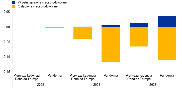 Uwagi: Żółte słupki pokazują ogólny wpływ zatorów handlowych uwzględniający oddziaływanie osłabienia sieci produkcyjnych. To oddziaływanie szacuje się za pomocą modelu obejmującego wiele krajów i sektorów przez porównanie wyników z modelu, który nie przewiduje substytucji nakładów i produkcji dóbr pośrednich w procesie wytwarzania towarów, z wynikami z modelu, który to uwzględnia. Niebieskie słupki pokazują wyniki z modelu ECB‑BASE, który pośrednio uwzględnia oddziaływanie sieci handlowych.