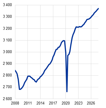 Uwagi: Dane odsezonowane i wyrównane dniami roboczymi. Dane historyczne mogą się różnić od najnowszych danych Eurostatu, których publikacja przypadła po dacie granicznej projekcji. Pionowa linia wyznacza początek horyzontu projekcji. Rewizje obliczono na podstawie liczb niezaokrąglonych.