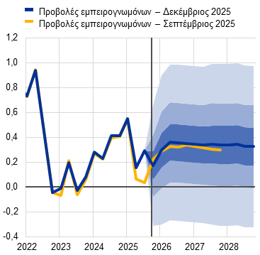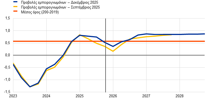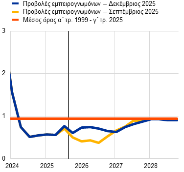 Πηγές: ΟΟΣΑ, Economic Outlook, 4 Δεκεμβρίου 2025· Προβλέψεις της Consensus Economics, 11 Δεκεμβρίου 2025 (τα στοιχεία για το 2027 και το 2028 προέρχονται από την έρευνα του Οκτωβρίου 2025)· Οικονομικές Προβλέψεις της Ευρωπαϊκής Επιτροπής, Φθινόπωρο 2025, 17 Νοεμβρίου 2025· Έρευνα της ΕΚΤ μεταξύ των Επαγγελματικών Φορέων Διενέργειας Προβλέψεων, 31 Οκτωβρίου 2025· ΔΝΤ, World Economic Outlook, 14 Οκτωβρίου 2025.