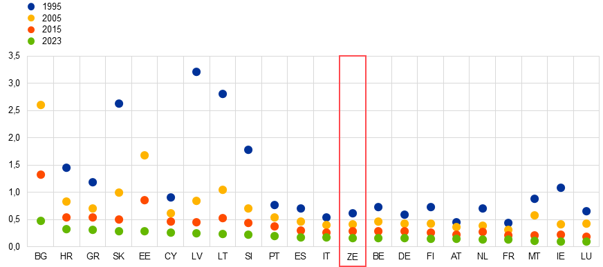 14. Για λεπτομέρειες σχετικά με τις προηγούμενες αξιολογήσεις των επιδράσεων του ΣΕΔΕ2 στο βασικό σενάριο των προβολών, βλ. το Πλαίσιο 2 με τίτλο «Αξιολόγηση των επιδράσεων στην ανάπτυξη και τον πληθωρισμό από τις πολιτικές πράσινες μετάβασης», στις μακροοικονομικές προβολές των εμπειρογνωμόνων του Ευρωσυστήματος για τη ζώνη του ευρώ του Δεκεμβρίου του 2024.