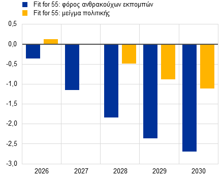 16. Το βασικό σενάριο των προβολών δεν περιλαμβάνει την επίδραση από τυχόν περαιτέρω μέτρα της ΕΕ που αποτελούν μέρος της δέσμης μέτρων «Fit for 55», καθώς η επίδρασή τους είτε δεν εκτιμήθηκε είτε διαπιστώθηκε ότι ήταν αμελητέα. Αυτό συνάδει με τις οικονομικές προβλέψεις του φθινοπώρου 2025 της Ευρωπαϊκής Επιτροπής, σύμφωνα με τις οποίες εκτιμάται ότι η επίδραση του μηχανισμού συνοριακής προσαρμογής άνθρακα (ΜΣΠΑ) στον πληθωρισμό βραχυπρόθεσμα θα είναι αμελητέα.