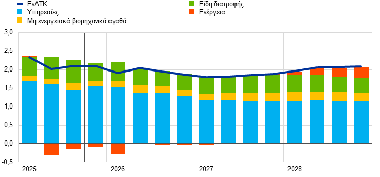 Ο πληθωρισμός προβλέπεται να μειωθεί από 2,1% το 2025 σε 1,9% το 2026 και 1,8% το 2027 και στη συνέχεια να αυξηθεί και να διαμορφωθεί στον μεσοπρόθεσμο στόχο της ΕΚΤ για 2% το 2028. Η αναμενόμενη μείωση του γενικού πληθωρισμού (όπως μετρείται με βάση τον Εναρμονισμένο Δείκτη Τιμών Καταναλωτή – ΕνΔΤΚ) στην αρχή του 2026 αντανακλά μια καθοδική επίδραση βάσης προερχόμενη από τις τιμές της ενέργειας, ενώ ο πληθωρισμός των μη ενεργειακών συνιστωσών θα πρέπει να συνεχίσει να υποχωρεί καθ’ όλη τη διάρκεια του 2026. Η συμβολή του πληθωρισμού της ενέργειας στον γενικό πληθωρισμό αναμένεται να παραμείνει συγκρατημένη έως τα τέλη του 2027 και στη συνέχεια να αυξηθεί σημαντικά το 2028 λόγω της αναμενόμενης εφαρμογής του Συστήματος Εμπορίας Δικαιωμάτων Εκπομπών 2 (ΣΕΔΕ2) της ΕΕ, με ανοδική επίδραση 0,2 της ποσοστιαίας μονάδας (ποσ. μον.) στον γενικό πληθωρισμό. Ο πληθωρισμός βάσει του ΕνΔΤΚ χωρίς την ενέργεια αναμένεται να μειωθεί από 2,5% το 2025 σε 2,2% το 2026 και 2,0% το 2027 και το 2028. Ο πληθωρισμός των ειδών διατροφής αναμένεται, βάσει των προβολών, να μειωθεί σημαντικά καθώς θα εξασθενούν οι επιδράσεις από τις προηγούμενες αυξήσεις των διεθνών τιμών των τροφίμων και τις δυσμενείς καιρικές συνθήκες στη διάρκεια του καλοκαιριού, και προβλέπεται να σταθεροποιηθεί σε επίπεδα ελαφρώς άνω του 2% από τα τέλη του 2026 και μετά. Ο πληθωρισμός (βάσει του ΕνΔΤΚ) χωρίς την ενέργεια και τα είδη διατροφής (HICPX) προβλέπεται να αποκλιμακωθεί από 2,4% το 2025 σε 2,0% το 2028, καθώς ο πληθωρισμός των υπηρεσιών θα μειώνεται εν μέσω άμβλυνσης των πιέσεων από το κόστος εργασίας και καθώς η προηγούμενη ανατίμηση του ευρώ θα ενσωματώνεται στην αλυσίδα τιμολόγησης, περιορίζοντας τον πληθωρισμό των αγαθών. Ο ρυθμός αύξησης των μισθών αναμένεται να συνεχίσει να υποχωρεί εντός του 2026 και στη συνέχεια να σταθεροποιηθεί γύρω στο 3%, εξέλιξη που θα υποστηριχθεί από την ανθεκτική αγορά εργασίας και την άνοδο της παραγωγικότητας με ρυθμό ελαφρώς χαμηλότερο του 1%. Η αύξηση του κόστους εργασίας ανά μονάδα προϊόντος αναμένεται να επιβραδυνθεί, αν και η επίδραση στον πληθωρισμό εκτιμάται ότι θα αντισταθμιστεί εν μέρει από τη σταδιακή ανάκαμψη των περιθωρίων κέρδους στη διάρκεια του χρονικού ορίζοντα προβολής. Σε σύγκριση με τις προβολές του Σεπτεμβρίου 2025, οι προοπτικές για τον γενικό πληθωρισμό (βάσει του ΕνΔΤΚ) έχουν αναθεωρηθεί προς τα πάνω κατά 0,2 ποσ. μον. για το 2026, αντανακλώντας τα πρόσφατα μη αναμενόμενα στοιχεία για τον πληθωρισμό (βάσει του ΕνΔΤΚ) αλλά και για την αύξηση των μισθών, γεγονός που οδήγησε σε αξιοσημείωτη αναθεώρηση προς τα πάνω των προοπτικών για τους μισθούς. Η προβολή για τον πληθωρισμό (βάσει του ΕνΔΤΚ) αναθεωρήθηκε ελαφρώς προς τα κάτω για το 2027 ως αποτέλεσμα της εκτιμώμενης χαμηλότερης συμβολής της συνιστώσας της ενέργειας, δεδομένου ότι η εφαρμογή του ΣΕΔΕ2 αναμένεται πλέον να αναβληθεί για το 2028 αντί του 2027, αν και η συμβολή αυτή προβλέπεται να αντισταθμιστεί εν μέρει από την επιτάχυνση του πληθωρισμού των υπηρεσιών.