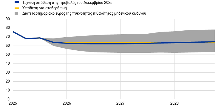 Όσον αφορά τις τεχνικές υποθέσεις, σε σύγκριση με τις προβολές του Σεπτεμβρίου οι μεταβολές είναι συνολικά περιορισμένες, εκτός από τις υποθέσεις για τις τιμές της ενέργειας και τις τιμές στο πλαίσιο του ΣΕΔΕ. Οι υποθέσεις για τις τιμές του πετρελαίου έχουν αναθεωρηθεί προς τα κάτω κατά περίπου 4% κατά μέσο όρο για το 2026-27 και οι υποθέσεις για τις τιμές χονδρικής του φυσικού αερίου κατά 8,6%, ενώ η υπόθεση για την τιμή των δικαιωμάτων εκπομπών στο πλαίσιο του ΣΕΔΕ1 με βάση τα συμβόλαια μελλοντικής εκπλήρωσης έχει αυξηθεί σημαντικά, κατά περίπου 15%. Μετά από τις πρόσφατες ανακοινώσεις, η εισαγωγή του συστήματος ΣΕΔΕ2 θεωρείται πλέον ότι θα αναβληθεί για ένα έτος, για το 2028, και η υπόθεση για την τιμή βασίζεται στην τιμή που χρησιμοποίησε η Ευρωπαϊκή Επιτροπή στις οικονομικές προβλέψεις του φθινοπώρου 2025 (46 ευρώ ανά τόνο CO2, η οποία είναι σημαντικά χαμηλότερη από την τιμή των 59 ευρώ ανά τόνο CO2 που είχε εκτιμηθεί για το 2027 στις προηγούμενες προβολές του Ευρωσυστήματος/της ΕΚΤ· βλ. Πλαίσιο 2 για περισσότερες λεπτομέρειες).[6] Το ευρώ υποτιμήθηκε κατά 0,5% έναντι του δολαρίου ΗΠΑ και κατά 0,1% σε όρους ονομαστικής σταθμισμένης συναλλαγματικής ισοτιμίας σε σχέση με τις προβολές του Σεπτεμβρίου. Οι υποθέσεις για τα βραχυπρόθεσμα επιτόκια έχουν αναθεωρηθεί οριακά μόνο, ενώ οι υποθέσεις για τα μακροπρόθεσμα επιτόκια έχουν αναθεωρηθεί προς τα κάτω κατά 0,2 ποσ. μον. τόσο για το 2026 όσο και για το 2027.