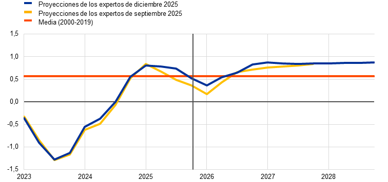 Notas: las revisiones se expresan en porcentajes para los niveles y en puntos porcentuales para las tasas de crecimiento y para los porcentajes anuales. Las revisiones de las tasas de crecimiento y de los tipos de interés se calculan utilizando cifras redondeadas a un decimal, mientras que las que se presentan como tasas de variación se calculan a partir de cifras sin redondear. Los supuestos técnicos relativos a los tipos de interés y a los precios de las materias primas en la zona del euro se basan en las expectativas de los mercados hasta el 26 de noviembre de 2025, fecha de cierre de los datos. Los precios del petróleo se refieren a los precios al contado y de los futuros del Brent. Los precios del gas se refieren a los precios al contado y de los futuros del gas en el mercado TTF neerlandés. Los precios de la electricidad se refieren a la media de los precios al contado y de los futuros en el mercado mayorista de los cinco países de mayor tamaño de la zona del euro. El precio «sintético» de los futuros en el régimen de comercio de derechos de emisión (RCDE1) de la UE (DEUE) es el valor obtenido por interpolación lineal a final de mes de los precios de los dos futuros de DEUE más próximos negociados en la Bolsa Europea de la Energía (EEX). Los precios mensuales de los futuros de DEUE se promedian después para obtener un equivalente a la frecuencia anual. En ausencia de un comercio significativo de derechos de emisión del RCDE2, los supuestos sobre precios se han establecido en consonancia con el supuesto adoptado por la Comisión Europea en sus previsiones económicas de otoño de 2025 (para más detalles, véase el recuadro 2). Las trayectorias de los precios de las materias primas están implícitas en los mercados de futuros en los diez días hábiles anteriores a la fecha de cierre de los datos. Se considera que los tipos de cambio bilaterales se mantendrán estables en el horizonte de proyección en los niveles medios registrados los diez días hábiles anteriores a la fecha de cierre de los datos. Los supuestos relativos a los rendimientos nominales de la deuda pública a diez años de la zona del euro se basan en la media de los rendimientos de la deuda pública a diez años de los países, ponderada por las cifras del PIB anual. Cuando existen los datos necesarios, el rendimiento nominal de la deuda pública a diez años de cada país se define como el rendimiento de los bonos de referencia a diez años prolongado utilizando rendimientos forward de bonos a la par calculados en la fecha de cierre de los datos a partir de las curvas de rendimientos correspondientes a cada país. Para los demás países, el rendimiento de la deuda pública a diez años correspondiente a cada país se define como el rendimiento de los bonos de referencia a diez años prolongado utilizando un diferencial constante (observado en la fecha de cierre de los datos) con respecto al supuesto técnico relativo a los tipos de interés libres de riesgo a largo plazo para la zona del euro.
