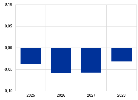 Se espera que el impacto de los recortes de los tipos de interés oficiales desde junio de 2024 compense gradualmente los efectos retardados del ciclo de endurecimiento anterior, respaldando así el crecimiento. Se considera que el impacto negativo del anterior ciclo de endurecimiento de la política monetaria sobre el crecimiento económico se ha disipado en gran medida. Sobre la base de las expectativas del mercado respecto a la evolución futura de los tipos de interés a la fecha de cierre de las proyecciones, se espera que la fase de relajación posterior tenga pequeños efectos positivos en 2027-2028. No obstante, existe una considerable incertidumbre en torno a la evaluación cuantitativa de estos efectos.