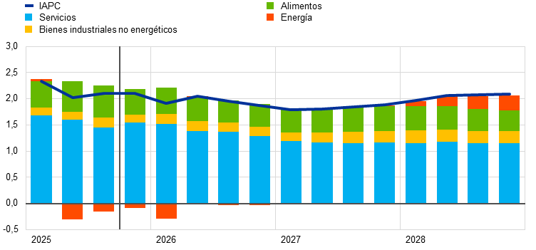 Se prevé que la inflación disminuya del 2,1 % en 2025 al 1,9 % en 2026 y al 1,8 % en 2027, y que aumente hasta el objetivo del BCE del 2 % a medio plazo en 2028. El descenso esperado de la inflación general (medida por el Índice Armonizado de Precios de Consumo (IAPC)) a principios de 2026 refleja un efecto de base a la baja derivado de los precios de la energía, mientras que la inflación de los componentes no energéticos debería seguir reduciéndose durante 2026. Se espera que la contribución de la tasa de variación de los precios de la energía a la inflación general se mantenga contenida hasta finales de 2027 y que aumente significativamente en 2028, impulsada por la aplicación prevista del nuevo régimen de comercio de derechos de emisión de la UE (RCDE2), con un impacto al alza de 0,2 puntos porcentuales en la inflación general. La inflación medida por el IAPC, excluida la energía, bajaría desde el 2,5 % en 2025 al 2,2 % en 2026 y al 2,0 % en 2027 y 2028. De acuerdo con las proyecciones, la inflación de los alimentos descenderá notablemente a medida que se moderen los efectos de las anteriores subidas de los precios de las materias primas alimenticias a escala mundial y de las condiciones meteorológicas adversas del verano, y se estabilizará en tasas ligeramente superiores al 2 % a partir de finales de 2026. La inflación medida por el IAPC, excluidos la energía y los alimentos (IAPCX), se moderaría desde el 2,4 % en 2025 hasta el 2,0 % en 2028, debido al descenso de la inflación de los servicios en un entorno de relajación de las presiones sobre los costes laborales, y a medida que la anterior apreciación del euro se transmita al proceso de formación de precios y frene la inflación de los bienes. El crecimiento de los salarios debería seguir moderándose hasta 2026, antes de estabilizarse en torno al 3 %, respaldado por un mercado laboral resiliente y un crecimiento de la productividad ligeramente inferior al 1 %. Se espera que el crecimiento de los costes laborales unitarios disminuya, aunque el impacto sobre la inflación se verá parcialmente compensado por una recuperación gradual de los márgenes durante el horizonte temporal considerado en las proyecciones. En comparación con las proyecciones de septiembre de 2025, las perspectivas para la inflación general medida por el IAPC se han revisado al alza en 0,2 puntos porcentuales para 2026, lo que refleja datos mejores de lo esperado sobre la inflación medida por el IAPC, además de un crecimiento de los salarios que ha dado lugar a una notable revisión al alza de las perspectivas salariales. La proyección referida a la inflación medida por el IAPC se ha revisado ligeramente a la baja para 2027 como resultado de la menor contribución prevista de la inflación de los precios energéticos, dado que ahora se espera que la aplicación del RCDE2 se posponga de 2027 a 2028, aunque se considera que esta contribución se verá parcialmente compensada por el aumento de la inflación de los servicios.