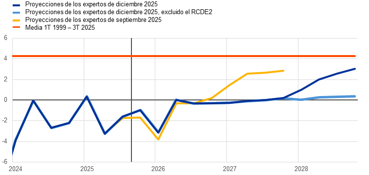 * En las proyecciones de septiembre de 2025 se partió del supuesto de un precio de los derechos de emisión del RCDE2 de 59 euros por tonelada de CO2 para 2027, mientras que en las proyecciones de diciembre de 2025 se ha considerado que el régimen no comenzará hasta 2028, con un precio más bajo de 46 euros por tonelada de CO2. Para más información, véase el recuadro 2.