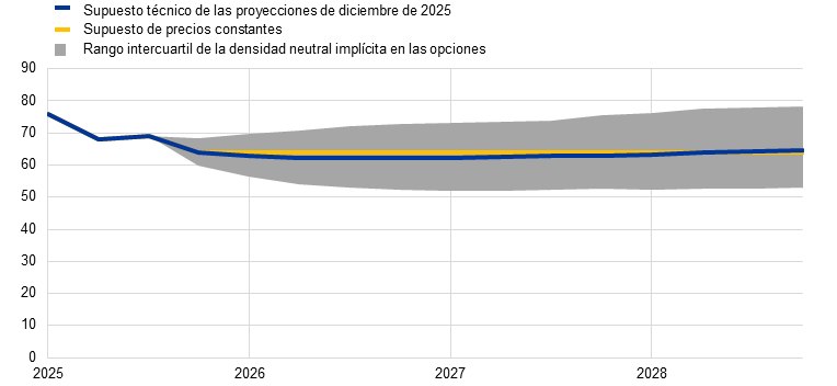 Nota: las densidades implícitas en las opciones de los precios del gas y del petróleo se obtienen de las cotizaciones de mercado a 26 de noviembre de 2025 para las opciones sobre los futuros sobre el Brent negociados en el ICE y sobre los futuros del gas natural negociados en el mercado TTF neerlandés con fechas de vencimiento trimestrales fijas.