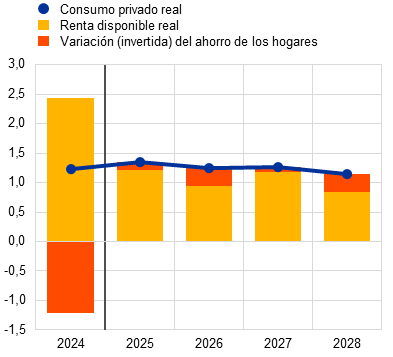 El crecimiento del PIB real debería seguir impulsado por la demanda interna, y la contribución negativa de las exportaciones netas debería disminuir hasta cero en 2027-2028. Desde la perspectiva del gasto (panel a del gráfico 3), se prevé que el consumo privado crezca con vigor a lo largo del horizonte de proyección, aportando la mayor contribución al crecimiento del PIB real. Se espera que el fortalecimiento del gasto de los hogares se vea respaldado por su creciente poder adquisitivo, como consecuencia del sólido crecimiento de los salarios y del empleo en un entorno de continuada capacidad de resistencia del mercado de trabajo. Asimismo, el crecimiento de la inversión debería superar el crecimiento del PIB durante todo el horizonte. Se espera que la inversión privada compense la ralentización de la inversión pública en 2027-2028 como consecuencia de la finalización de la financiación proporcionada por el programa Next Generation EU (NGEU). A lo largo del horizonte de proyección, el crecimiento de la inversión debería estar impulsado por la reducción de la incertidumbre, el aumento del gasto en defensa e infraestructuras, el fortalecimiento de los beneficios y la mejora de la demanda asociada a la recuperación cíclica. En cambio, se espera que el crecimiento de las exportaciones siga siendo moderado a pesar de la mejora de la demanda externa, ya que los persistentes retos en materia de competitividad de la zona del euro, los aranceles estadounidenses y la anterior apreciación del euro lastran las exportaciones. Es probable que esto dé lugar a pérdidas continuadas de cuota en los mercados de exportación. En consecuencia, se prevé que la contribución de las exportaciones netas al crecimiento del PIB real sea negativa en 2025 y 2026, con un crecimiento de las importaciones superior al de las exportaciones. Se considera que estas contribuciones negativas se verán parcialmente compensadas por la contribución positiva de la variación de existencias en 2025.