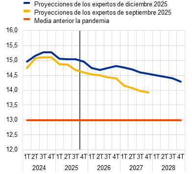 Se prevé que el crecimiento de los costes laborales unitarios disminuya hasta 2027, impulsado por el menor crecimiento de los salarios y, en cierta medida, por el aumento de la productividad, y que posteriormente se estabilice en el 2,1 % en 2028. El crecimiento de los costes laborales unitarios aumentó ligeramente en el tercer trimestre de 2025 y se espera que se mantenga por encima del 3 % hasta principios de 2026. Se prevé que una moderación del crecimiento de la remuneración por asalariado dé lugar a una ralentización del crecimiento de los costes laborales unitarios a lo largo de 2026. En promedio, se espera que el crecimiento de los costes laborales unitarios se modere desde el 3,3 % en 2025 hasta el 2,6 % en 2026 y el 2,0 % en 2027, para repuntar al 2,1 % en 2028, ligeramente por encima de su media a largo plazo. En comparación con las proyecciones de septiembre de 2025, el crecimiento de los costes laborales unitarios se ha revisado al alza para todos los años del horizonte temporal considerado debido al mayor crecimiento de los salarios, pese al ligero aumento de la productividad.