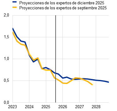 Proyecciones de los expertos del Eurosistema | Diciembre de 2025 | 1,4 | 1,2 | 1,4 | 1,4 | 2,1 | 1,9 | 1,8 | 2,0 | 2,4 | 2,2 | 1,9 | 2,0 | |