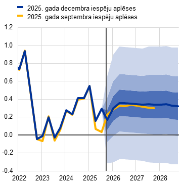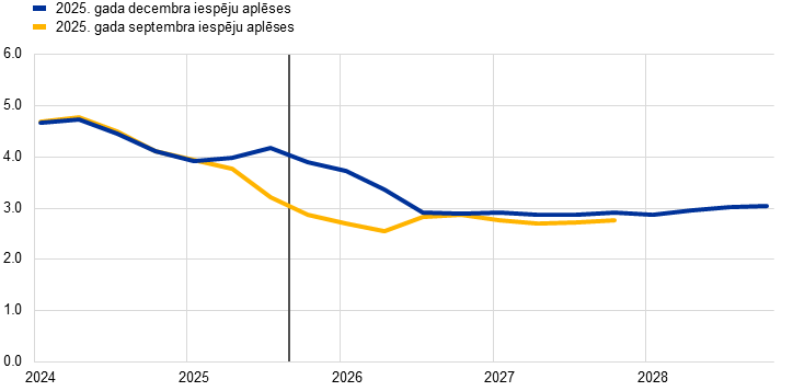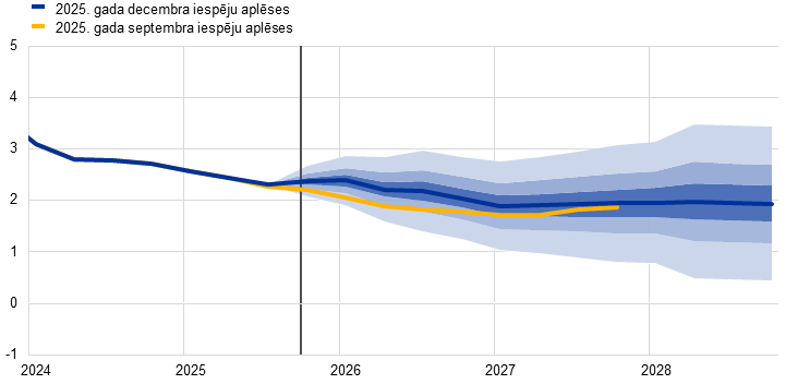 Paredzams, ka inflācija samazināsies no 2.1 % 2025. gadā līdz 1.9 % 2026. gadā un tad līdz 1.8 % 2027. gadā, bet pēc tam 2028. gadā pieaugs līdz ECB noteiktajam 2 % vidējā termiņa mērķim. Kopējās inflācijas (ko mēra ar saskaņoto patēriņa cenu indeksu – SPCI) gaidāmais kritums 2026. gada sākumā atspoguļo ar enerģijas cenām saistīto lejupvērsto bāzes efektu, savukārt neenerģijas komponentu inflācijai vajadzētu turpināt pazemināties visu 2026. gadu. Paredzams, ka enerģijas cenu inflācijas devums kopējā inflācijā līdz 2027. gada beigām saglabāsies neliels, bet pēc tam 2028. gadā ievērojami pieaugs sakarā ar gaidāmo otrās ES emisijas kvotu tirdzniecības sistēmas (ETS2) ieviešanu, kas radīs augšupvērstu ietekmi uz kopējo inflāciju 0.2 procentu punktu apmērā. Gaidāms, ka SPCI inflācija (neietverot enerģijas un pārtikas cenas) pazemināsies no 2.5 % 2025. gadā līdz 2.2 % 2026. gadā un līdz 2.0 % 2027. un 2028. gadā. Paredzams, ka pārtikas cenu inflācija būtiski kritīsies, izzūdot pasaules pārtikas izejvielu cenu agrākā kāpuma un vasaras nelabvēlīgo laikapstākļu ietekmei, un tiek uzskatīts, ka 2026. gada nogalē tā stabilizēsies nedaudz virs 2 % līmeņa. Paredzams, ka SPCI inflācija (neietverot enerģijas un pārtikas cenas; SPCIX) pazemināsies no 2.4 % 2025. gadā līdz 2.0 % 2028. gadā, vājāka darbaspēka izmaksu spiediena apstākļos sarūkot pakalpojumu cenu inflācijai un agrākajam euro kursa kāpumam atspoguļojoties cenu noteikšanas ķēdē un pazeminot preču cenu inflāciju. Darba samaksas pieaugumam visu 2026. gadu būtu jāturpina palēnināties, pirms tas nostabilizēsies aptuveni 3 % līmenī. To veicinās noturīgs darba tirgus un darba ražīguma pieaugums, kura temps būs nedaudz zem 1 %. Gaidāms, ka vienības darbaspēka izmaksu pieaugums kļūs mērenāks, lai gan šķiet, ka tā ietekmi uz inflāciju daļēji kompensēs pakāpenisks peļņas maržu pieaugums iespēju aplēšu periodā. Salīdzinājumā ar 2025. gada septembra iespēju aplēsēm kopējās SPCI inflācijas perspektīva 2026. gadam koriģēta un paaugstināta par 0.2 procentu punktiem, atspoguļojot jaunākos pārsteidzošos SPCI inflācijas un darba samaksas pieauguma datus. Darba samaksas pieauguma dati izraisīja būtisku darba samaksas perspektīvas augšupvērstu korekciju. 2027. gada SPCI inflācijas iespēju aplēse koriģēta un nedaudz pazemināta sakarā ar pieņēmumu par mazāku enerģijas cenu inflācijas devumu, jo pašlaik gaidāms, ka ETS2 ieviešana tiks atlikta no 2027. gada uz 2028. gadu, lai gan paredzams, ka šo devumu daļēji kompensēs spēcīgāka pakalpojumu cenu inflācija.