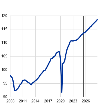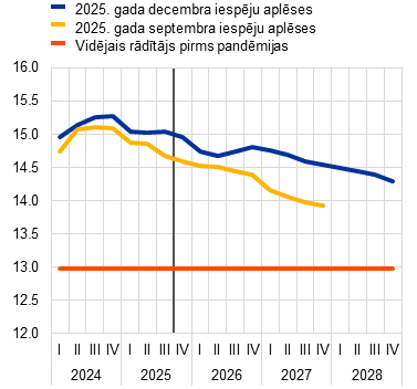 Paredzams, ka vienības darbaspēka izmaksu pieaugums 2027. gadā samazināsies, ko noteiks zemāks darba samaksas kāpums un zināmā mērā augstāks darba ražīgums, bet pēc tam 2028. gadā tas stabilizēsies 2.1 % līmenī. Vienības darbaspēka izmaksu pieaugums 2025. gada 3. ceturksnī nedaudz palielinājās, un gaidāms, ka tas saglabāsies virs 3 % līdz 2026. gada sākumam. Gaidāms, ka atlīdzības vienam nodarbinātajam pieauguma mazināšanās noteiks vienības darbaspēka izmaksu kāpuma palēninājumu 2026. gadā. Paredzams, ka vienības darbaspēka izmaksu pieaugums vidēji saruks no 3.3 % 2025. gadā līdz 2.6 % 2026. gadā un 2.0 % 2027. gadā, bet 2028. gadā palielināsies līdz 2.1 %, nedaudz pārsniedzot ilgtermiņa vidējo rādītāju. Salīdzinājumā ar 2025. gada septembra iespēju aplēsēm vienības darbaspēka izmaksu pieaugums katram iespēju aplēšu perioda gadam koriģēts un paaugstināts sakarā ar straujāku darba samaksas kāpumu, neraugoties uz nedaudz augstāku darba ražīgumu.