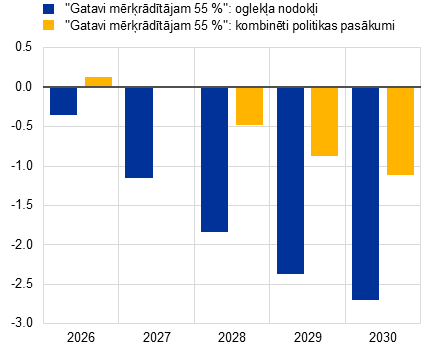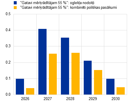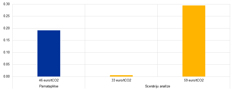 Iespēju aplēšu pamatscenārijā nav iekļauta ietekme saistībā ar turpmākiem ES pasākumiem paketes "Gatavi mērķrādītājam 55 %" ietvaros, jo to ietekme nav aplēsta vai atzīta par nenozīmīgu. Tas atbilst Eiropas Komisijas 2025. gada rudens ekonomiskajām prognozēm, kurās aplēsts, ka oglekļa ievedkorekcijas mehānisma ietekme uz inflāciju īstermiņā būs nenozīmīga.