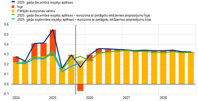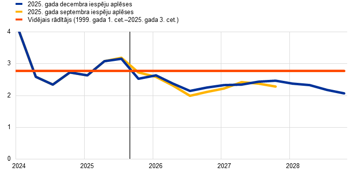Avoti: OECD Tautsaimniecības perspektīvas, 2025. gada 4. decembris; Consensus Economics prognozes, 2025. gada 11. decembris (2027. un 2028. gada dati ņemti no 2025. gada oktobra apsekojuma); Eiropas Komisijas 2025. gada rudens ekonomiskās prognozes, 2025. gada 17. novembris; ECB aptauja Survey of Professional Forecasters, 2025. gada 31. oktobris un SVF Pasaules tautsaimniecības perspektīva, 2025. gada 14. oktobris.