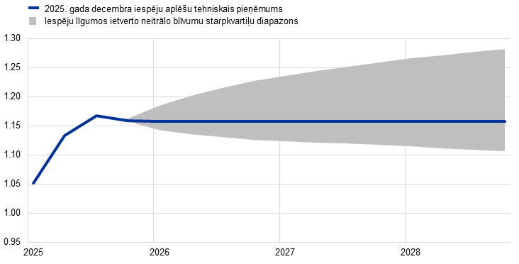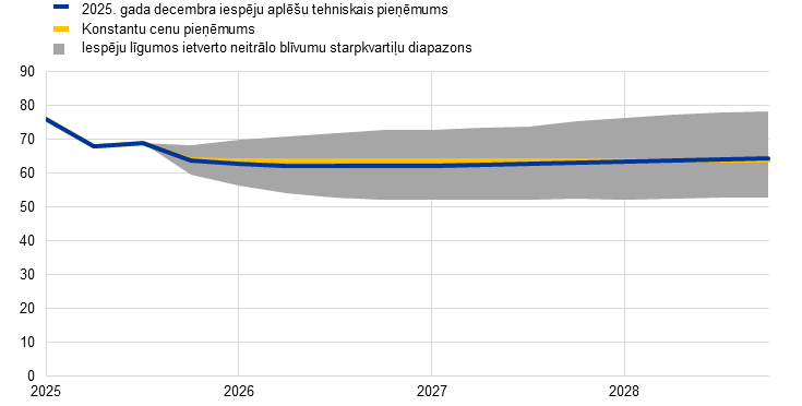 Piezīmes. Līmeņu korekcijas izsaka procentos un pieauguma tempa un gada procentuālo rādītāju korekcijas – procentu punktos. Izaugsmes tempa un procentu likmju korekcijas aprēķina, izmantojot skaitļus, kas noapaļoti līdz vienam ciparam aiz komata, savukārt korekcijas, kas uzrādītas kā procentuālās pārmaiņas, aprēķina, izmantojot nenoapaļotus skaitļus. Tehniskie pieņēmumi par eurozonas procentu likmēm un izejvielu cenām balstīti uz tirgus gaidām atbilstoši stāvoklim 2025. gada 26. novembrī. Naftas cenas ir Brent jēlnaftas tagadnes darījumu cenas un biržā tirgoto nākotnes līgumu cenas. Gāzes cenas ir Nīderlandes biržas gāzes tagadnes darījumu cenas un biržā tirgoto nākotnes līgumu cenas. Elektroenerģijas cenas ir piecu lielāko eurozonas valstu vidējās vairumtirdzniecības tagadnes darījumu cenas un biržā tirgoto nākotnes līgumu cenas. ETS1 kvotu (EUA) "sintētiskā" biržā tirgoto nākotnes līgumu cena atvasināta kā divu tuvāko Eiropas Enerģijas biržas EUA nākotnes līgumu lineāri interpolētā vērtība mēneša beigās. Pēc tam tiek noteiktas EUA biržā tirgoto nākotnes līgumu mēneša vidējās cenas, lai iegūtu gada rādītāja ekvivalentu. Tā kā ETS2 kvotas faktiski netiek tirgotas, pieņēmumus par šīm cenām noteica speciālisti saskaņā ar Eiropas Komisijas pieņēmumiem 2025. gada rudens ekonomiskajās prognozēs (sīkāku informāciju sk. 2. ielikumā). Uz izejvielu cenu tendencēm norāda biržā tirgoto nākotnes darījumu tirgi 10 darbadienu laikā pirms pēdējā datu aktualizēšanas datumā. Pieņemts, ka divpusējie valūtu kursi iespēju aplēšu periodā nemainīsies salīdzinājumā ar vidējiem rādītājiem, kuri dominēja 10 darbadienu periodā, kas beidzās pēdējā datu aktualizēšanas dienā. Pieņēmumi par eurozonas valstu valdības 10 gadu obligāciju nominālajām ienesīguma likmēm balstās uz valstu 10 gadu obligāciju vidējām ienesīguma likmēm, kas svērtas ar IKP gada rādītājiem. Ja pieejami nepieciešamie dati, konkrētu valstu valdības 10 gadu obligāciju nominālās ienesīguma likmes definē kā 10 gadu etalonobligāciju ienesīguma likmes, ko pielāgo, izmantojot biržā netirgoto nākotnes līgumu nominālās ienesīguma likmes, kas pēdējā datu aktualizēšanas datumā iegūtas no atbilstošajām attiecīgo valstu ienesīguma līknēm. Pārējām valstīm attiecīgās valsts 10 gadu obligāciju ienesīguma likmes definē kā 10 gadu etalonobligāciju ienesīguma likmi, ko attiecina uz garāku periodu, izmantojot nemainīgu starpību (kas novērota pēdējā datu aktualizēšanas datumā) ar tehnisko pieņēmumu par eurozonas bezriska ilgtermiņa procentu likmi.