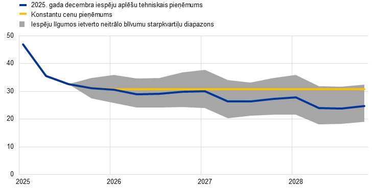 Piezīme. Iespēju līgumos ietvertie naftas un gāzes cenu blīvumi iegūti no tirgū kotētajām cenām 2025. gada 26. novembrī – Brent jēlnaftas iespēju līgumu cenām ICE biržā un dabasgāzes nākotnes līgumu (ar fiksētiem ceturkšņa līguma beigu termiņiem) cenām Nīderlandes biržā.