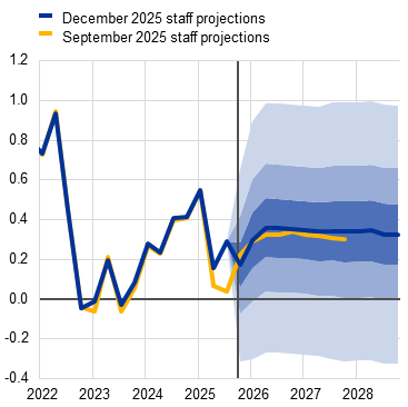 The euro area economy is proving to be resilient despite the challenging global environment. Real GDP increased by 0.3% in the third quarter of 2025, which was above the September projections. This followed volatile developments in the first half of the year, reflecting the effects of frontloading in response to higher US trade tariffs and related uncertainty, as well as the impact of sharp fluctuations in Irish data. Domestic demand should remain the main driver of euro area growth, bolstered by rising real wages and employment, in the context of resilient labour markets with record low unemployment rates. Additional government spending on infrastructure and defence announced this year, especially in Germany, alongside improved financing conditions stemming from monetary policy rate cuts since June 2024, is also expected to support the domestic economy. On the external side, while competitiveness challenges persist, including some that are of a structural nature, exports are expected to pick up next year. This improvement is attributed to a rebound in foreign demand amid declining trade policy uncertainty, despite a gradually unfolding impact from higher tariffs. Annual average real GDP growth is projected to be 1.4% in 2025, 1.2% in 2026, 1.4% in 2027 and 1.4% in 2028. Compared with the September 2025 projections, GDP growth has been revised up over the whole projection horizon, reflecting better than expected data, reduced trade policy uncertainty, stronger foreign demand and lower energy commodity prices.[1]